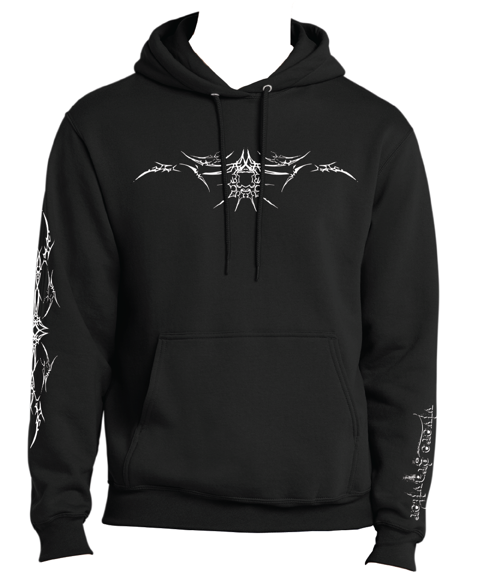 Black heavy weight hoodie. Screen print on front, back and sleeves.